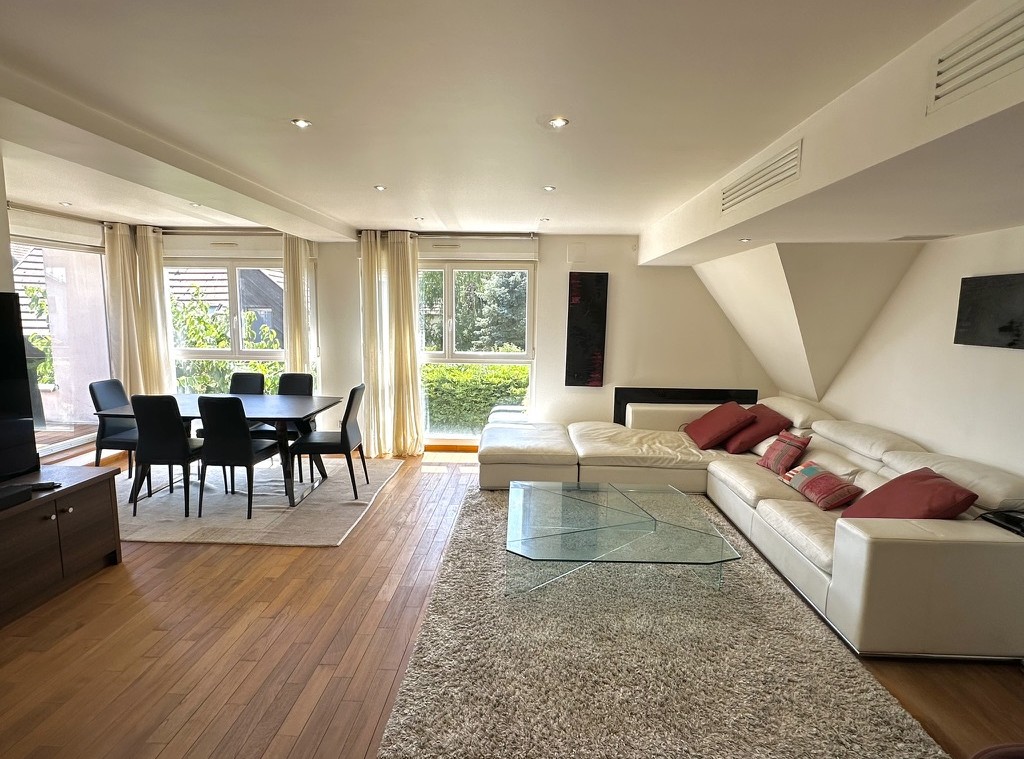 5P en duplex au dernier étage avec terrasse.Robertsau, dans impasse au calme, à deux pas du parc du Pourtales et des champs et de la forêt de la Wantzenau, dans petite résidence de 3 appartements.